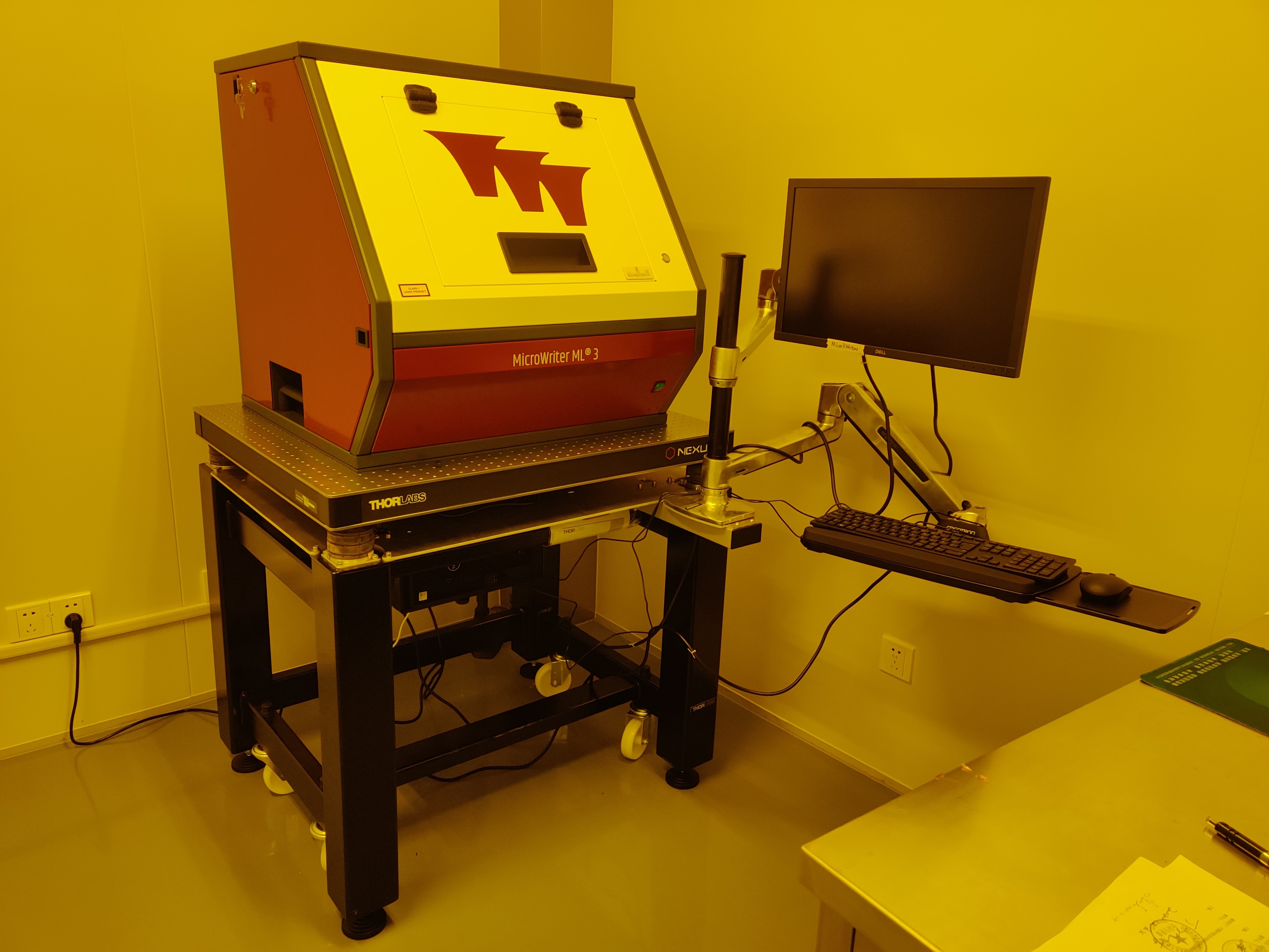 | 一、设备型号、关键性能参数 型号:Microwriter ML3 关键性能参数: 加工尺寸:8寸以下兼容 曝光光源:385nm 直写分辨率:0.4um,0.6μm,1μm,2μm,5μm 对准显微镜镜头:x3,x5,x10,x20,x50 自动切换 最快直写速度: 4mm2/min @ 0.4μm 17mm2/min @ 0.6μm 50mm2/min @ 1μm 120mm2/min @ 2μm 180mm2/min @ 5μm 最小线宽尺寸:0.4μm 多层套刻精度:±0.5μm 最小栅格精度:100nm 样品台最小位移步长:50nm 二、设备原理: Microwriter是通过电脑控制数字微镜阵列(DMD)像素的开和关以控制光路,将设计版图映射到晶片表面的光刻胶上,每次曝光一个写场中的图形,接着曝光下一个写场的图形,直至将整个晶片完全曝光。样品台(放置样品)被平面内XY两轴向的精密位移电机控制,能实现写场间的高精度拼接。该光刻设备无需加工物理掩膜版,设计好的电子版图文件导入控制电脑,经过软件处理和曝光参数设定进行全自动图形曝光。 三、应用范围: 亚微米级图形结构制备 二维材料电极图形制备 无固定掩模光刻加工 三维结构图形制备 四、设备特色: 灰度直写:255级; 温度补偿功能:调节系统激光干涉仪校正参数,补偿温度偏差; 虚拟掩模板对准:曝光前调用虚拟掩模板,辅助套刻对准; 气动减震光学平台 自动晶圆检查工具:可自动识别晶圆中心 五、应用领域: MEMS、半导体、光学领域等.
